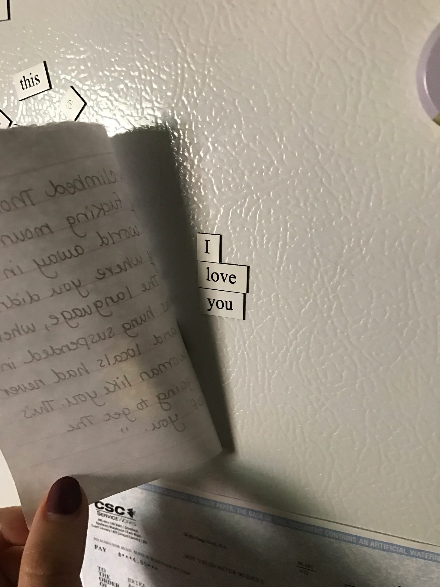 Hans took my face between his hands in the wake of my word vomit and told me to go look on my fridge. While I’d been in China, starting shit just to hear him say he valued me, he also fretted over being in love. He arranged my fridge magnets and hidden a message for me behind a note I had taped up; it was a message intended to be seen after he’d left for Los Angeles, after we’d parted ways amicably, after our lives carried on however they were meant to. But instead the words came out of me of their own volition and his words were there, too. Validation as reciprocal love. Validation that maybe we could try, that maybe all the effort I’d given elsewhere was meant for this.